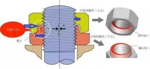Hard lock 防松螺母是有上下呈“凹”“凸”形狀的兩種螺母組合成的。下方呈凸?fàn)畹穆菽?在加工時(shí)中心稍許錯(cuò)動(dòng)(偏心加工),起到楔子的作用。上方呈凹狀的螺母,則不作偏離中心的加工(圓形加工),于是形成了錘子揳打楔子的功能,上下螺母的“凸”面和“凹”面都是錐形面,這樣即使很小的軸向壓力,也可以產(chǎn)生很大的徑向壓力?!巴埂薄鞍肌卞F面間的壓力會(huì)傳遞到上下螺母的咬合螺紋上,螺紋咬合面間和凸凹錐面上都會(huì)產(chǎn)生很大的摩擦阻力距,這樣起到防松的作用。