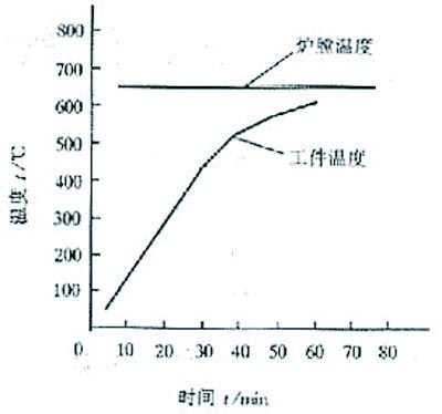 由于該工件厚度較厚,體積較大,采用硬加熱規(guī)范,把爐膛溫度預置到650℃,然后把安置好釬料和釬劑的工件放入爐膛進行加熱,待工件溫度上升到600℃即可出爐冷卻。圖3為爐膛和工件溫度與時間的變化曲線。2.3 焊后清洗 釬焊后的工件在20%左右的硝酸溶液中清洗,可以得到滿意的清洗效果。